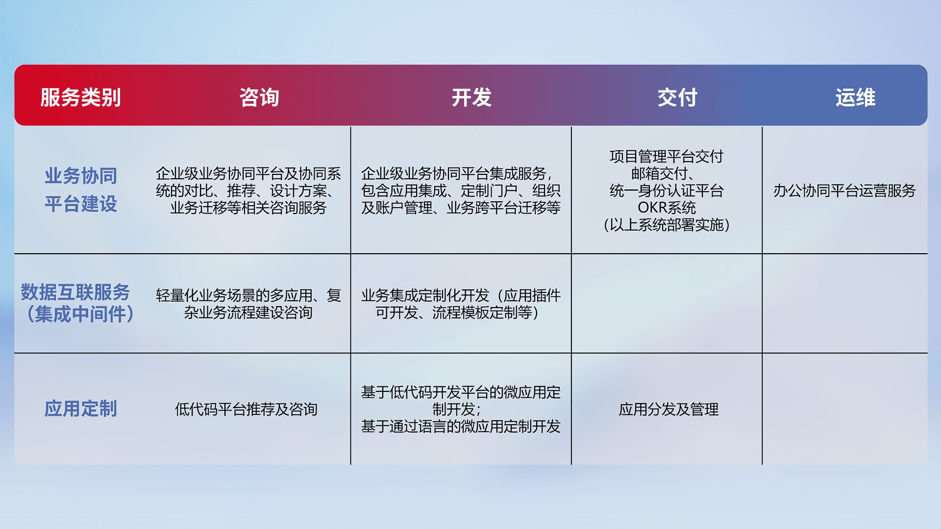针对钉钉、、、、企微、、IDaas等平台级产品提供产品的规划、、、、方案、、、、交付、、、、定制化开发等服务,,,实现如统一协同办公、、、智能客户服务、、、混合会议管理、、智能数据查询、、、、等业务场景,,,实现数字化转型。。。