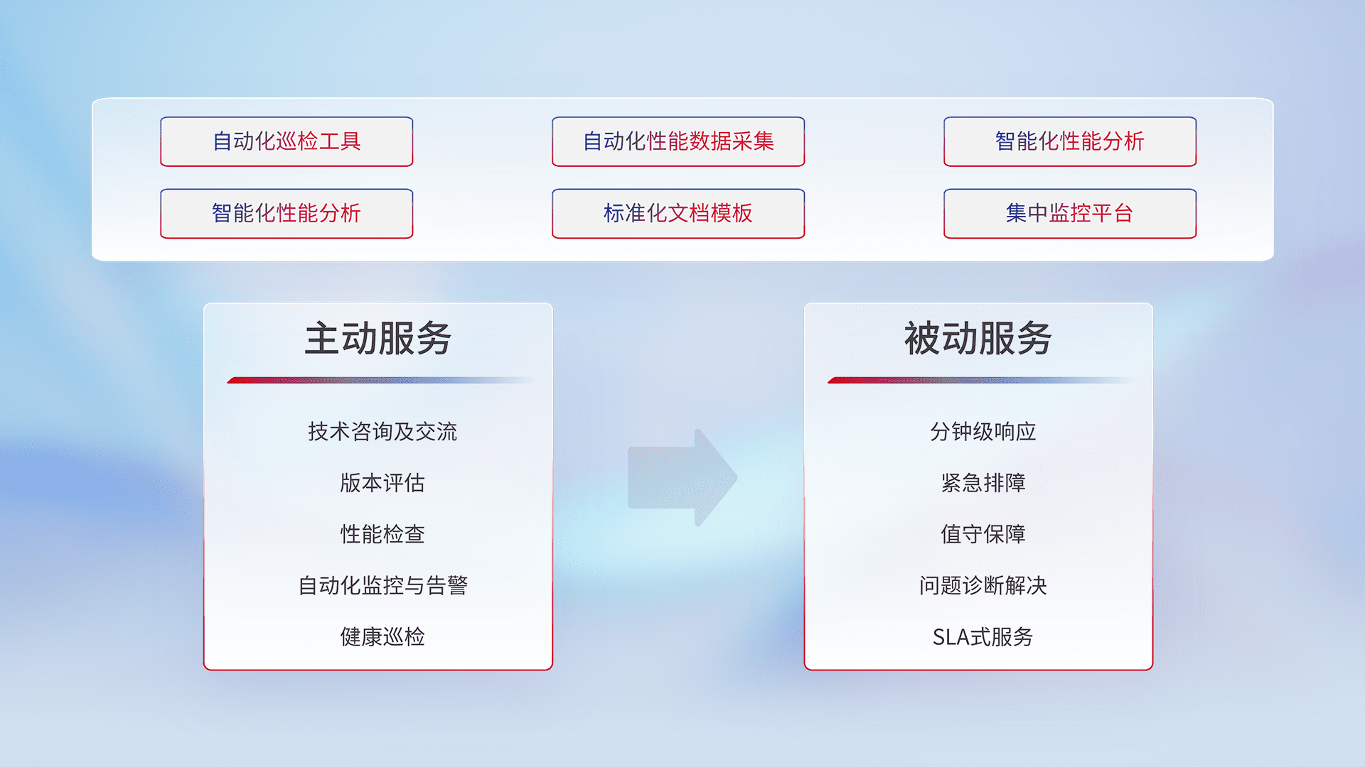 智能化工具和标准化文档,,保障服务质量,,,,提供主动服务(包含技术咨询、、、版本评估、、、、性能检查、、自动化监控与告警、、健康巡检)和被动服务包含(分钟级响应、、紧急排障、、值守保障、、、、问题诊断解决、、、、SLA服务)。。。。